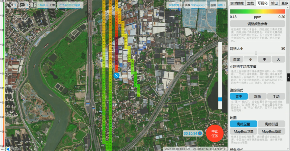 无人机具备灵活性高、视域广、及时连续的特点,通过不同航高来实现高空间、大面积目标的监测,而在监测过程中对有污染排放情况,可以降低飞行航高实现低空较小范围的准确监测。无人机一次可搭载多种气体监测探头,可以对远程图像的摄影和摄像,还可以对区域上空的二氧化硫、二氧化氮、臭氧和挥发性有机物等多个指标进行监测,并形成数值曲线图。