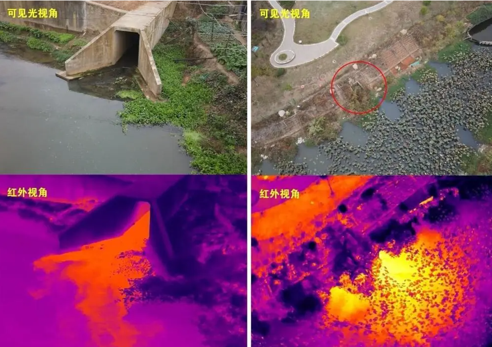 无人机搭载热红外云台相机,观测河道所有物体发射或反射的不可见热辐射,无论光照条件如何,夜晚也能无阻碍检测,巡查排污口,对违法排放污水进行快速溯源。排污口进行精准快速定位,强化监督发现机制,为河道长效管理工作的精细化、智能化提供有力支撑。