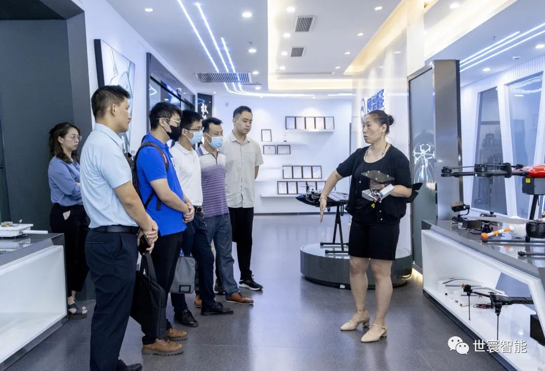 韶关高新区招商局局长一行在世寰智能副总经理的陪同下参观了一行参观了世寰智能的展厅环境,了解了世寰智能无人机相关内容及挂载应用,并观看了三维GIS基础管理平台应用演示及“自动机库”远程演示。