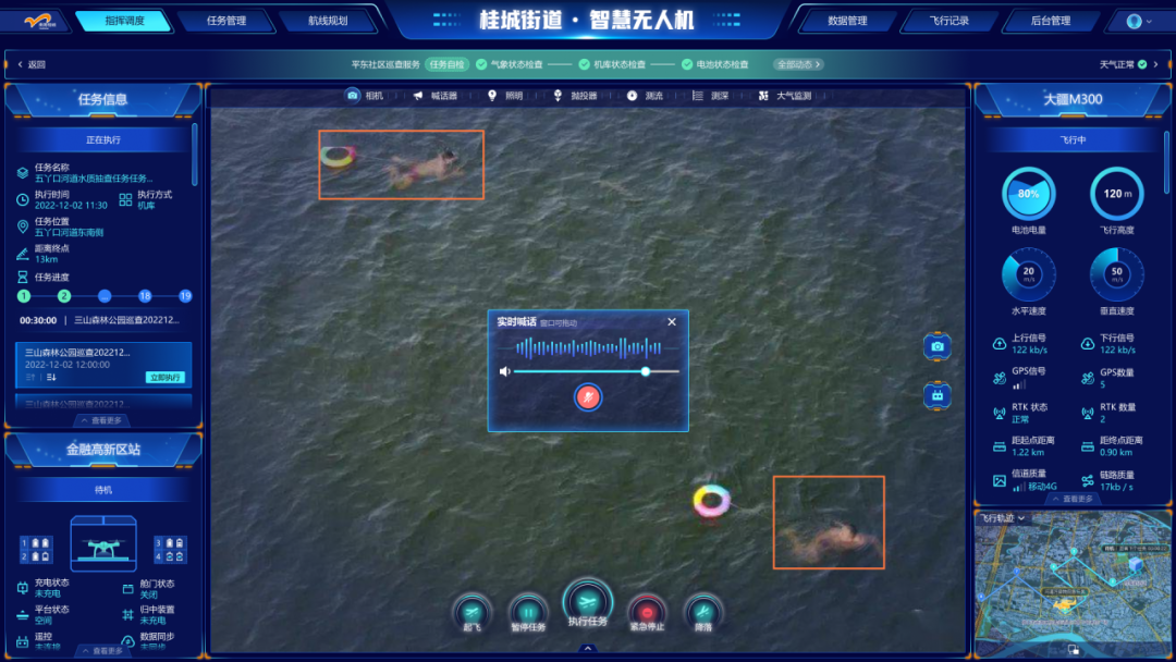 从共享无人机指挥调度中心大屏画面看到,无人机按规划航线巡查到东平河岸,忽然“嘀、嘀、嘀”警报声响起,大屏画面弹出警告信息,系统AI分析功能显示有疑似人员在河里游泳,工作人员马上切换手动控制模式,调整无人机上的云台摄像机,对焦发现靠河岸边四名人员野泳,随即工作人员控制无人机抵近野泳人员,并打开远程喊话功能劝导人员离开。