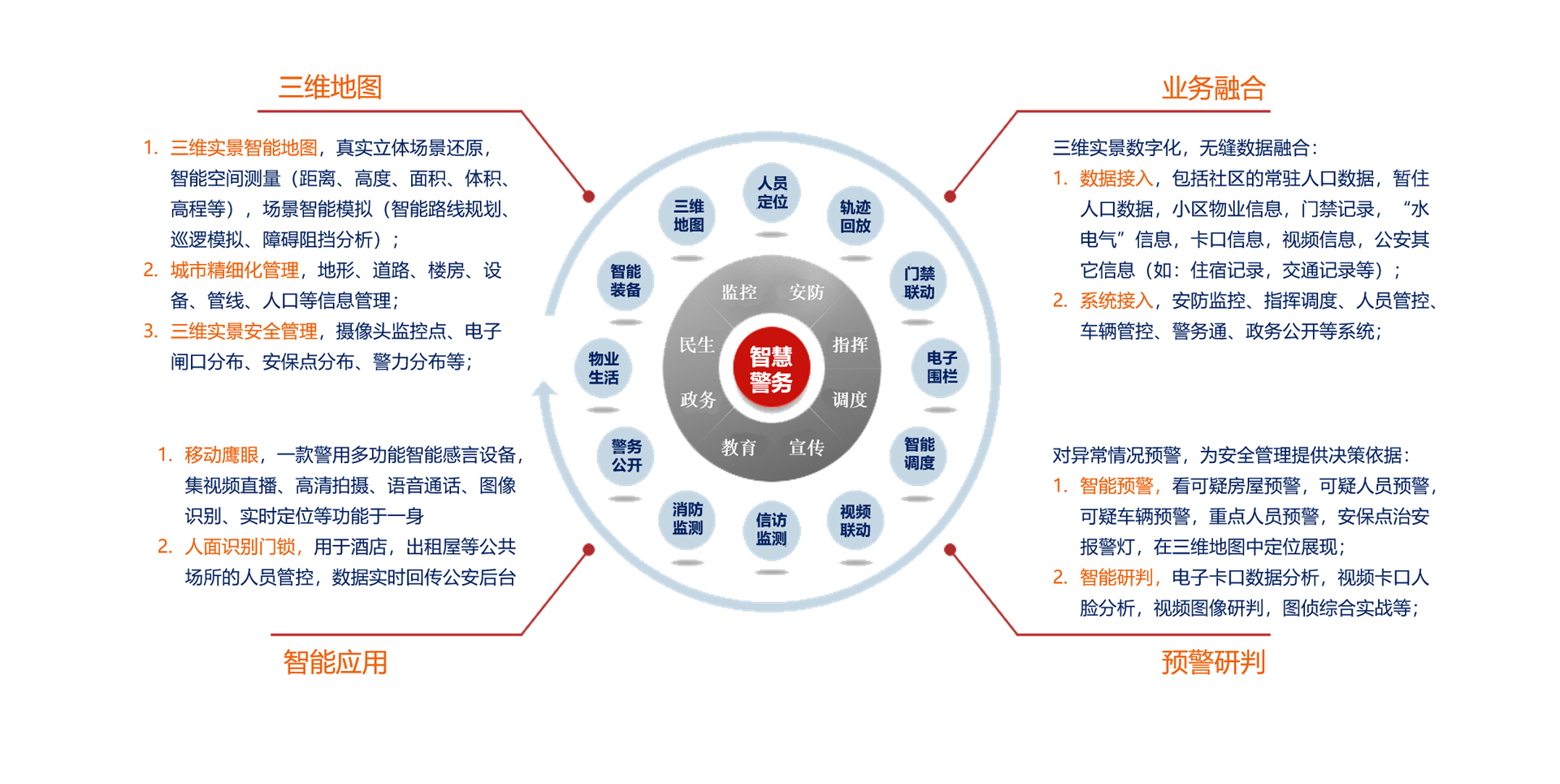 智慧公安系统协助公安解决动态巡查效率低、有盲区的问题,通过无人机及时发现、查处各种违法违规行为,做到早预防、早发现、及时查处;迅速到达监察的区域,获得准确的视频和高清图像,帮助公安干警高效破案,实现“缩短反应时间”和“减少人力耗费”的目标。