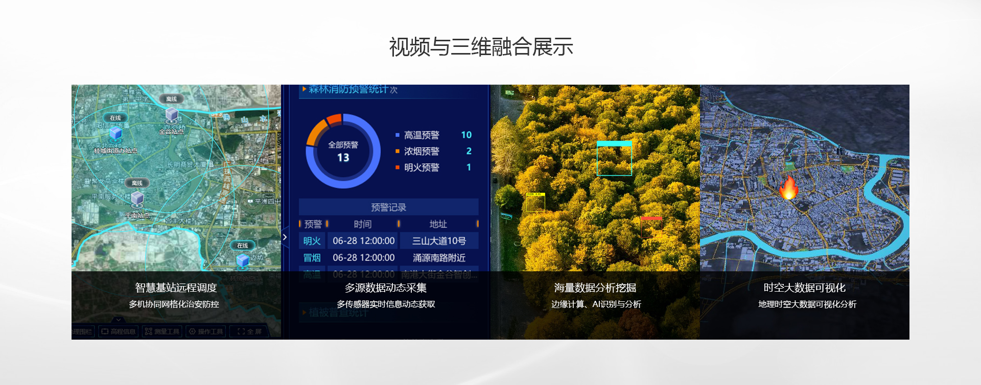 智慧消防管理平台通过无人机搭载热成像仪,实现监测人员、生态、灾害等信息,对现场进行大面积多批次航空摄影,快速生成多时间点的大面积影像,重点区域进行视频回传,为掌握火情覆盖及演变情况提供准确资料,协助现场指挥。